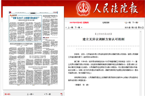 2017年7月20日 《人民法院报》 江苏如东县法院建立无异议调解方案认可机制