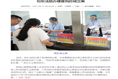 2017年8月17日 中国网 如东法院办理首例跨越立案