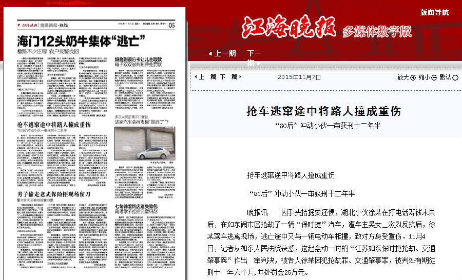 11月7日《江海晚报》05版 抢车逃窜途中将路人撞成重伤 80后冲动小伙一审获刑十二年半