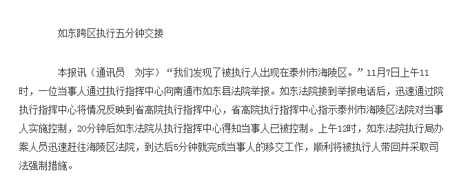 11月11日 《江苏法制报》 法苑短波 如东跨区执行五分钟交接