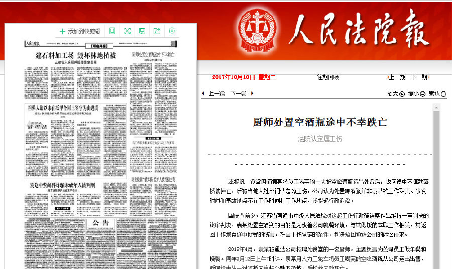 2017年10月10日 《人民法院报 》厨师处置空酒瓶途中不幸跌亡,法院认定属工伤
